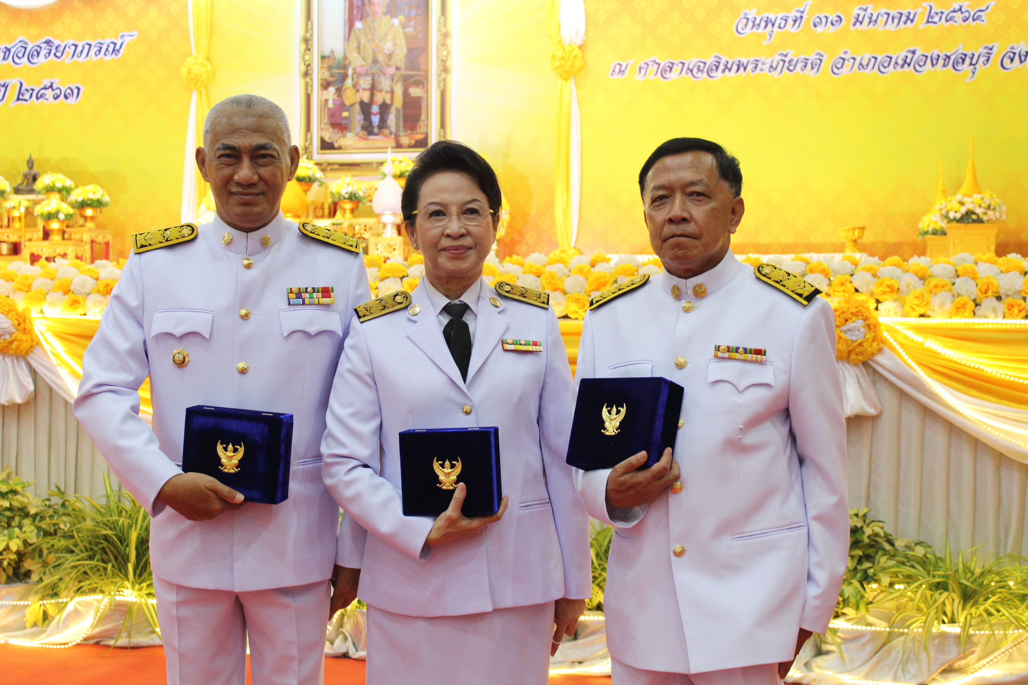 วันที่ 31 มีนาคม 2564 เวลา 13.30 น. นายภัครธรณ์ เทียนไชย ผู้ว่าราชการจังหวัดชลบุรี เป็นประธานพิธีรับพระราชทานเครื่องราชอิสริยาภรณ์ ชั้นสายสะพาย ประจำปี 2563 ต่อหน้าพระบรมฉายาลักษณ์พระบาทสมเด็จพระเจ้าอยู่หัว ของข้าราชการสังกัดกระทรวงมหาดไทย ที่ปฏิบัติหน้าที่ในส่วนภูมิภาค และส่วนท้องถิ่น ณ ศาลาเฉลิมพระเกียรติ อำเภอเมืองชลบุรี จังหวัดชลบุรี โดยมีข้าราชการผู้ได้รับพระราชทานเครื่องราชอิสริยาภรณ์ชั้นสายสะพาย จำนวนทั้งสิ้น 89 ราย ประกอบด้วย ชั้นประถมาภรณ์ช้างเผือก (ป.ช.) จำนวน 34 ราย และชั้นประถมาภรณ์มงกุฎไทย (ป.ม) จำนวน 55 ราย สำหรับจังหวัดชลบุรีมีข้าราชการสังกัดกรมการพัฒนาชุมชนที่เข้ารับพระราชทานเครื่องราชอิสริยาภรณ์ ชั้นสายสะพาย ชั้นประถมาภรณ์มงกุฎไทย (ป.ม.) ในครั้งนี้ จำนวน 3 ราย ได้แก่ นายประเมิน อุมา พัฒนาการจังหวัดชลบุรี นายสุรพล ศรจิตต์ ข้าราชการบำนาญ (อดีตผู้อำนวยการศูนย์ศึกษาและพัฒนาชุมชนชลบุรี) และนางชัชนีย์ จันเสงี่ยม ข้าราชการบำนาญ (อดีตพัฒนาการอำเภอพานทอง)