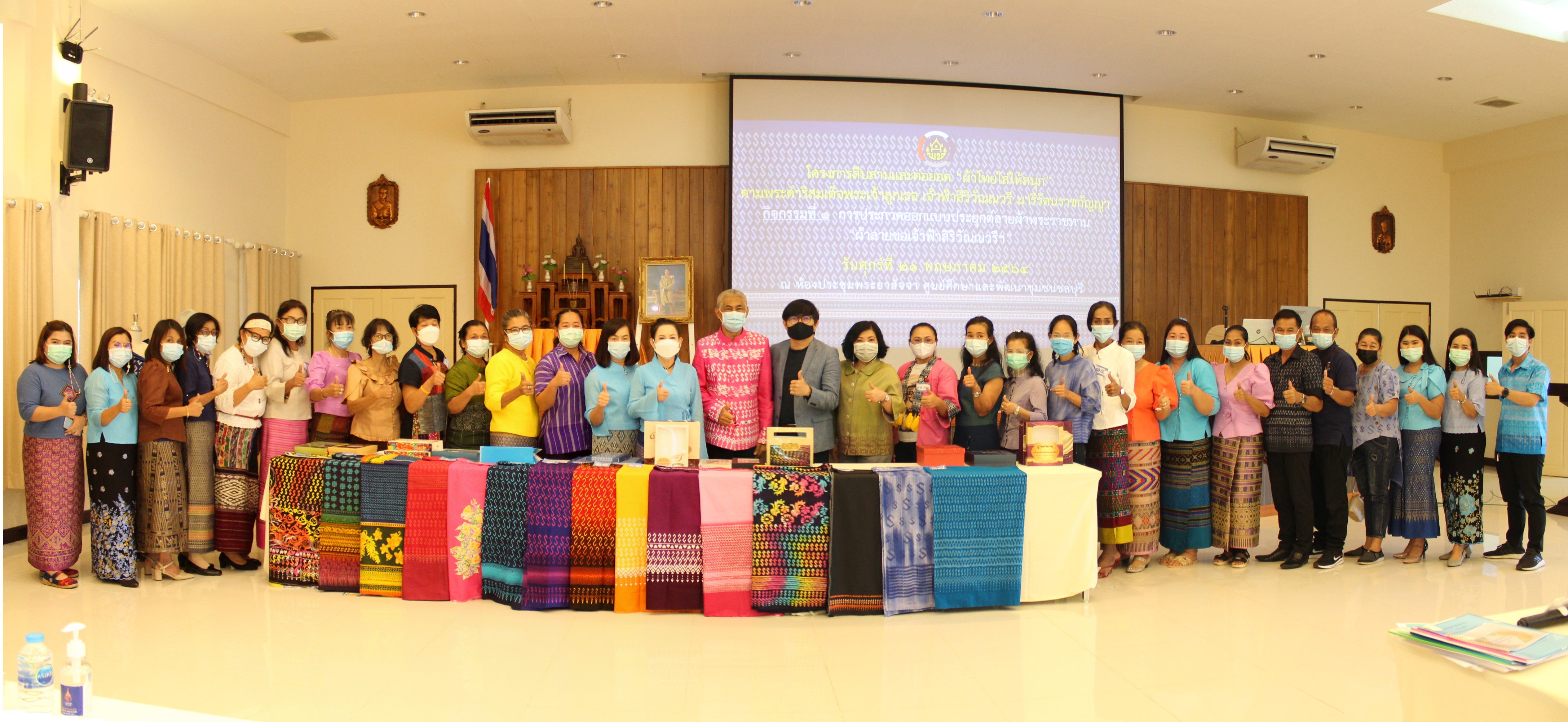 วันที่ 21 พฤษภาคม 2564 เวลา 08.30 น. สำนักงานพัฒนาชุมชนจังหวัดชลบุรี จัดการประกวดผ้าพระราชทาน “ผ้าลายขอเจ้าฟ้าสิริวัณณวรีฯ” จังหวัดชลบุรี (ผ้าผืน) ภายใต้โครงการสืบสานและต่อยอด “ผ้าไทยใส่ให้สนุก” ตามพระราชดำริ สมเด็จพระเจ้าลูกเธอเจ้าฟ้าสิริวัณณวรี นารีรัตนราชกัญญา ณ ห้องประชุมพระยาสัจจา ศูนย์ศึกษาและพัฒนาชุมชนชลบุรี อำเภอเมืองชลบุรี จังหวัดชลบุรี โดยมีผู้สนใจส่งผ้าผืน “ลายขอเจ้าฟ้าสิริวัณณวรีฯ เข้าร่วมประกวด จำนวน 13 ราย รวม 17 ชิ้นงาน ทั้งนี้ ได้รับเกียรติจากผู้ทรงคุณวุฒิและผู้เชี่ยวชาญร่วมเป็นกรรมการตัดสินการประกวด ได้แก่ รศ.จักรกริศน์ บัวแก้ว อาจารย์คณะศิลปกรรมศาสตร์ มหาวิทยาลัยบูรพา ผศ.ดร.ปาริชาติ คุณปลื้ม รองคณบดีคณะบริหารธุรกิจ มหาวิทยาลัยศรีปทุม และ ดร.สุดใจ ผ่องแผ้ว ผู้เชี่ยวชาญด้านผ้าและการพัฒนาผลิตภัณฑ์ชุมชน ในการนี้ นายประเมิน อุมา พัฒนาการจังหวัดชลบุรี พร้อมด้วย นางสาวชุดากานต์ กำจัดภัย ผู้อำนวยการกลุ่มงานส่งเสริมการพัฒนาชุมชน ร่วมเป็นกรรมการตัดสินการประกวดในครั้งนี้ด้วย