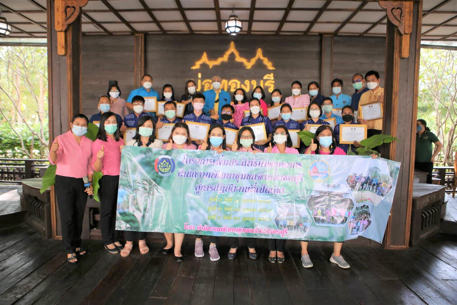 วันที่ 19 ตุลาคม 2564 สำนักงานพัฒนาชุมชนจังหวัดชลบุรี จัดโครงการ “เพิ่มประสิทธิภาพบุคลากรสำนักงานพัฒนาชุมชนจังหวัดชลบุรีสู่การปฏิบัติงานที่เป็นเลิศ” รุ่นที่ 2 ณ บ่อทองบุรี โฮมสเตย์ แอนด์ รีสอร์ท ตำบลวัดสุวรรณ อำเภอบ่อทอง จังหวัดชลบุรี โดยมี นายประเมิน อุมา พัฒนาการจังหวัดชลบุรี เป็นประธานเปิดโครงการฯ มีวัตถุประสงค์เพื่อพัฒนาสมรรถนะในการปฏิบัติงานของบุคลากรในสังกัด แลกเปลี่ยนเรียนรู้วิธีการปฏิบัติงาน ทบทวนผลการดำเนินงานในปีงบประมาณ พ.ศ. 2564 และเตรียมความพร้อมในการขับเคลื่อนงานพัฒนาชุมชนในปีงบประมาณ พ.ศ. 2565 รวมทั้งเพื่อเชิดชูเกียรติบุคลากรในสังกัดที่มีผลการปฏิบัติงานดีเด่นระดับจังหวัดในปีงบประมาณ พ.ศ. 2564 กลุ่มเป้าหมายเข้าร่วมโครงการประกอบด้วย ผู้อำนวยการกลุ่มงานทุกกลุ่มงาน นักวิชาการพัฒนาชุมชนจังหวัด พัฒนาการอำเภอ และพัฒนากร อำเภอพนัสนิคม อำเภอบ่อทอง อำเภอหนองใหญ่ และอำเภอเกาะจันทร์