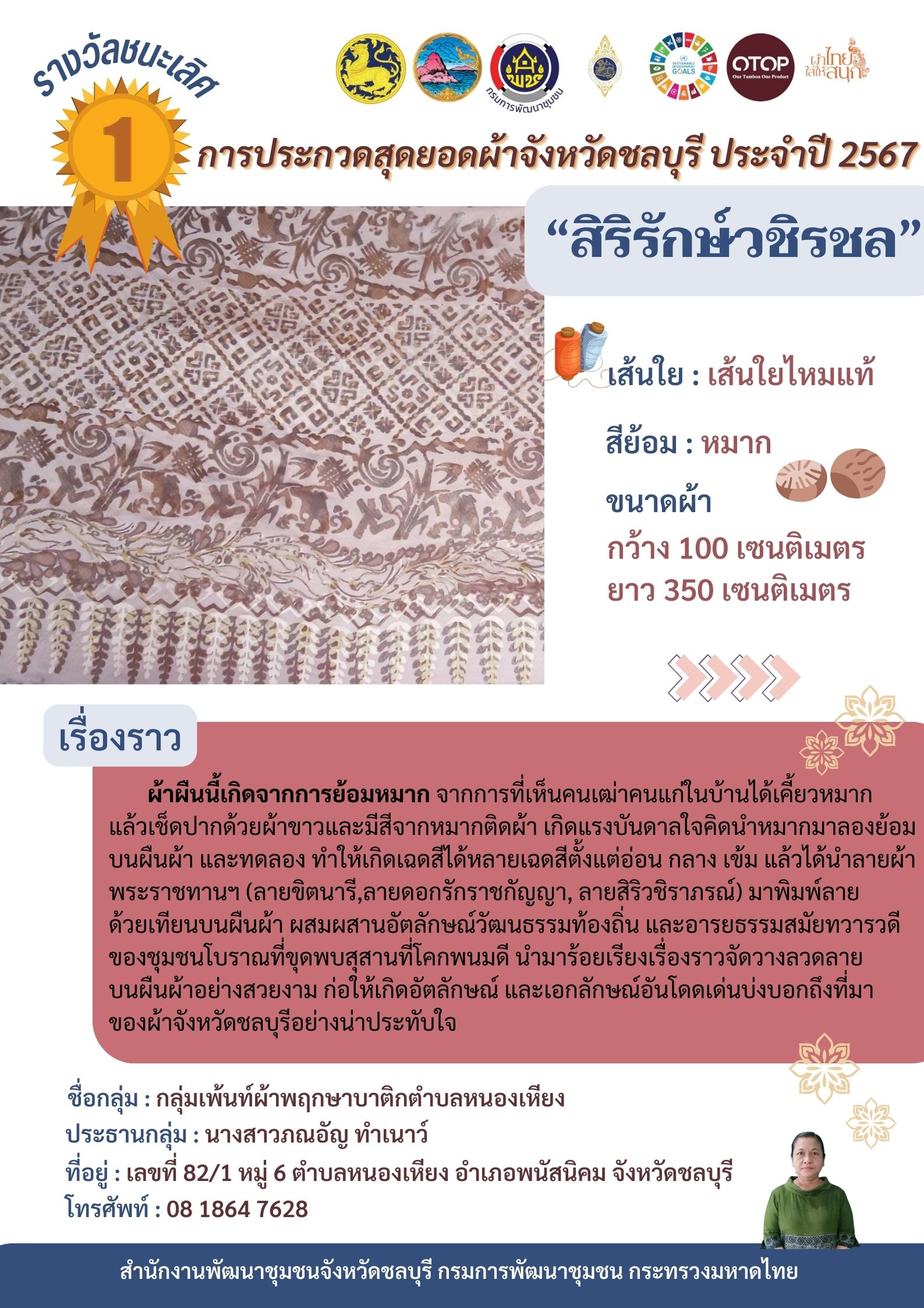 ผลการตัดสินสุดยอดผ้าจังหวัดชลบุรี รางวัลชนะเลิศ ได้แก่ ผ้าลาย “สิริรักษ์วชิรชล” จากกลุ่มเพ้นท์ผ้าพฤกษาบาติกตำบลหนองเหียง อำเภอพนัสนิคม จังหวัดชลบุรี ผลิตจากเส้นใยไหมแท้ สีธรรมชาติที่ย้อมจากลูกหมาก ประธานกลุ่ม คือ นางสาวภณอัญ ทำเนาว์