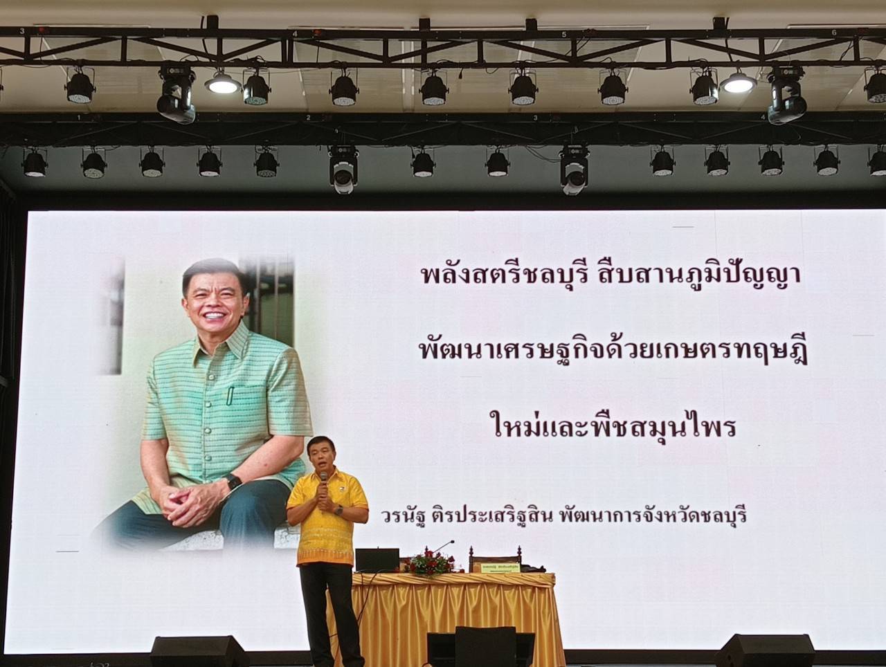 วันที่ 27 มิถุนายน 2567 เวลา 13.00 น. ณ สวนนงนุชพัทยา ตำบลนาจอมเทียน อำเภอสัตหีบ จังหวัดชลบุรี นายวรนัฐ ติรประเสริฐสิน พัฒนาการจังหวัดชลบุรี เป็นวิทยากรในโครงการสัมมนาเชิงปฏิบัติการ : พลังสตรีชลบุรี สืบสานภูมิปัญญา พัฒนาเศรษฐกิจด้วยเกษตรทฤษฎีใหม่และพืชสมุนไพร มีวัตถุประสงค์เพื่อส่งเสริมให้สตรีจังหวัดชลบบุรีได้รับความรู้ เกี่ยวกับเกษตรทฤษฎีใหม่ สมุนไพรไทย และภูมิปัญญาไทยท้องถิ่น ให้สตรีมีการตระหนักถึงภาวะโลกร้อน ความสำคัญของการอนุรักษ์ทรัพยากรธรรมชาติและสิ่งแวดล้อม รวมทั้งสตรีมีจิตอาสาช่วยเหลือสังคม ก่อเกิดประโยชน์แก่ชุมชนและสังคมต่อไป กลุ่มเป้าหมายประกอบด้วย คณะกรรมการพัฒนาสตรีจังหวัดชลบุรี 11 อำเภอ ผู้บริหารและเจ้าหน้าที่ที่เกี่ยวข้อง จำนวนทั้งสิ้น 500 คน