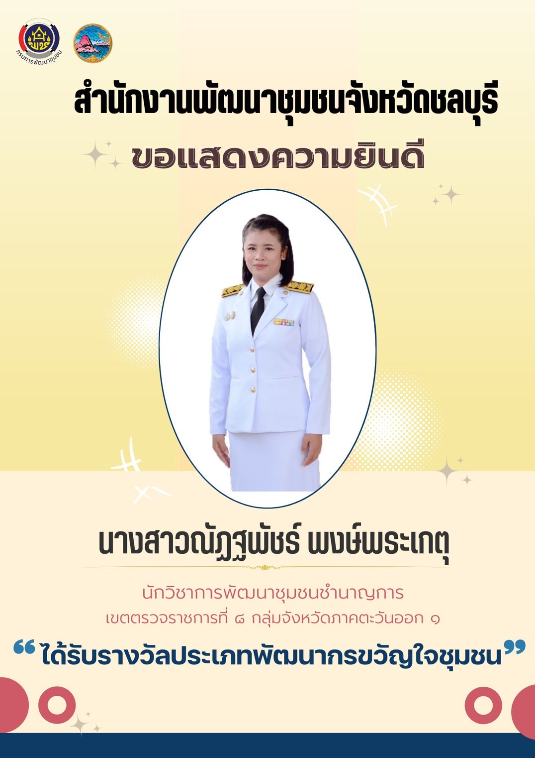 🔅🔅สำนักงานพัฒนาชุมชนจังหวัดชลบุรี ขอแสดงความยินดีแก่ผู้ได้รับรางวัลประเภทพัฒนากรขวัญใจชุมชน จำนวน 2 ราย