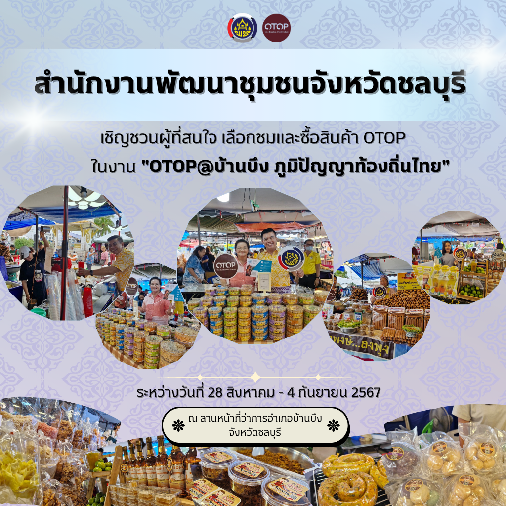 📌 โดยการจัดงาน OTOP@บ้านบึงฯ ในครั้งนี้ คณะกรรมการเครือข่ายหนึ่งตำบล หนึ่งผลิตภัณฑ์ (OTOP) อำเภอบ้านบึง ร่วมกับสำนักงานพัฒนาชุมชนอำเภอบ้านบึง จังหวัดชลบุรี พร้อมด้วยเครือข่ายกลุ่มอาชีพและผู้ผลิต ผู้ประกอบการหนึ่งตำบลหนึ่งผลิตภัณฑ์ จังหวัดชลบุรี มีวัตถุประสงค์เพื่อส่งเสริมช่องทางการตลาดและเพิ่มรายได้ให้แก่ให้แก่ผู้ผลิต ผู้ประกอบการ OTOP และเพื่อเสริมสร้างศักยภาพให้แก่ผู้ผลิต ผู้ประกอบการ OTOP ด้านการแข่งขันทางธุรกิจและฟื้นฟูเศรษฐกิจท้องถิ่นและชุมชน ซึ่งกำหนดจัดงานระหว่างวันที่ 28 สิงหาคม – 4 กันยายน 2567 ณ ลานหน้าที่ว่าการอำเภอบ้านบึง จังหวัดชลบุรี