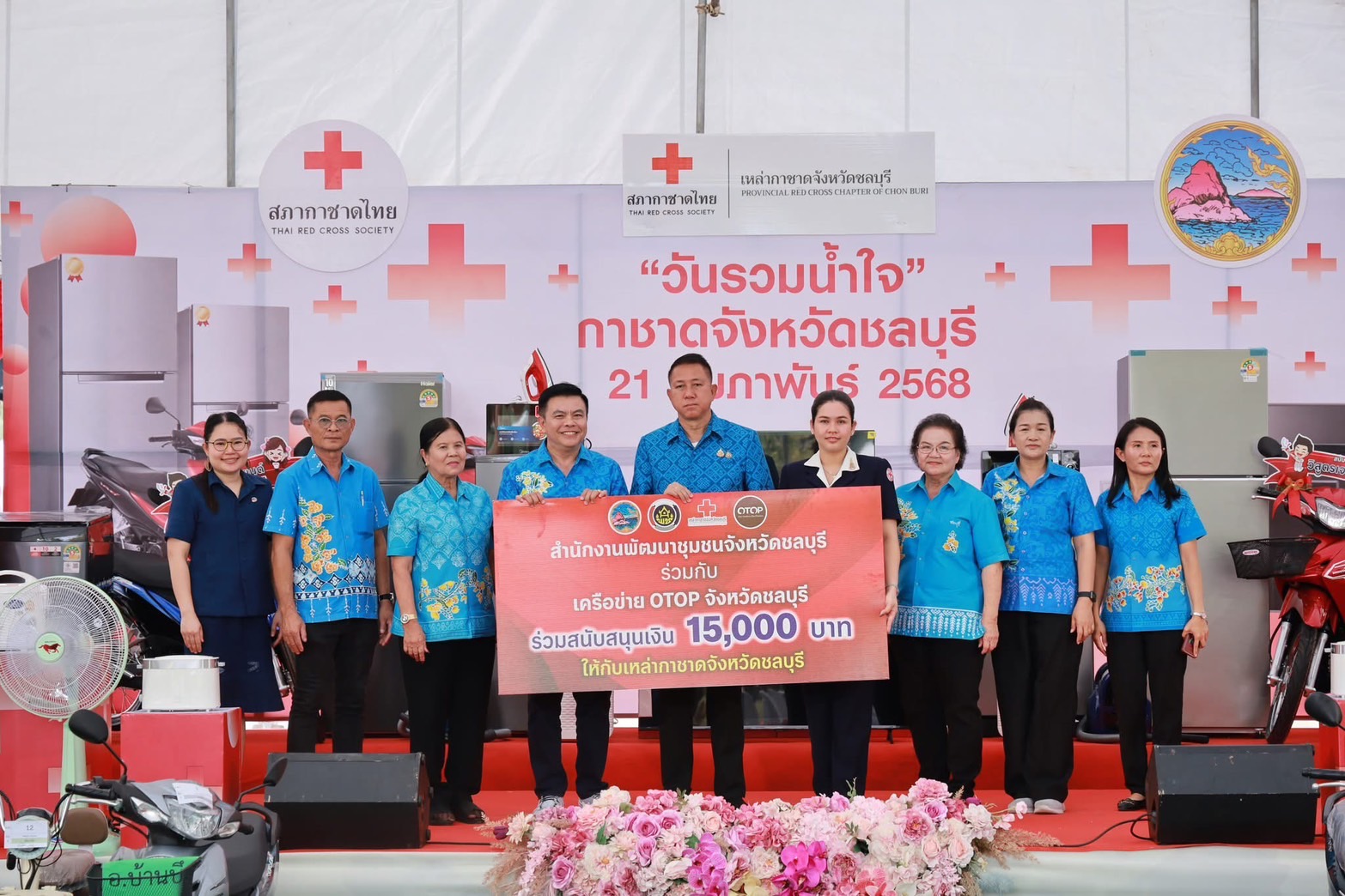 ทั้งนี้ สำนักงานพัฒนาชุมจังหวัดชลบุรี ร่วมกับเครือยข่าย OTOP จังหวัดชลบุรี ร่วมสนับสนุนเงิน จำนวน 15,000 บาท ให้กับเหล่ากาชาดจังหวัดชลบุรี