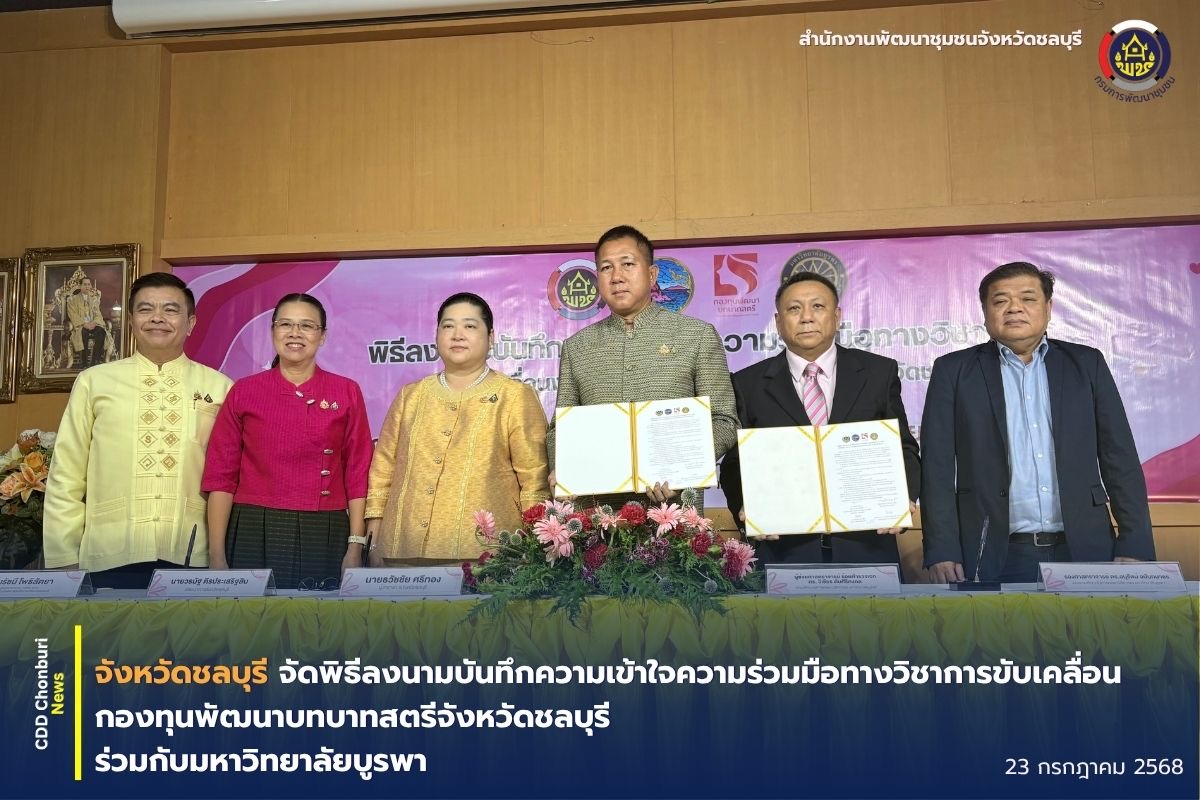 🗓️ วันที่ 23 กรกฎาคม 2568 ณ ห้องประชุมชนะ ประณมศรี ชั้น 4 อาคารคณะรัฐศาสตร์และนิติศาสตร์ มหาวิทยาลัยบูรพา อำเภอเมืองชลบุรี จังหวัดชลบุรี – สำนักงานพัฒนาชุมชนจังหวัดชลบุรี โดยสำนักงานเลขานุการคณะอนุกรรมการบริหารกองทุนพัฒนาบทบาทสตรีระดับจังหวัด จังหวัดชลบุรี จัดพิธีลงนามบันทึกความเข้าใจความร่วมมือทางวิชาการ การขับเคลื่อนงานกองทุนพัฒนาบทบาทสตรีจังหวัดชลบุรี ระหว่างกองทุนพัฒนาบทบาทสตรีจังหวัดชลบุรี กับมหาวิทยาลัยบูรพา โดยได้รับเกียรติจาก นายธวัชชัย ศรีทอง ผู้ว่าราชการจังหวัดชลบุรี เป็นประธานในพิธี และมีนายวรนัฐ ติรประเสริฐสิน พัฒนาการจังหวัดชลบุรี เป็นผู้กล่าวรายงานวัตถุประสงค์ของการจัดกิจกรรมดังกล่าว ซึ่งมีเป้าหมายเพื่อส่งเสริมให้นิสิตมหาวิทยาลัยบูรพาได้เข้าร่วมเป็นสมาชิกกองทุนพัฒนาบทบาทสตรี และสามารถเข้าถึงแหล่งเงินทุน รวมถึงการบูรณาการความร่วมมือในการพัฒนาผลิตภัณฑ์ ช่องทางตลาด และการส่งเสริมอาชีพให้แก่กลุ่มสตรีในพื้นที่