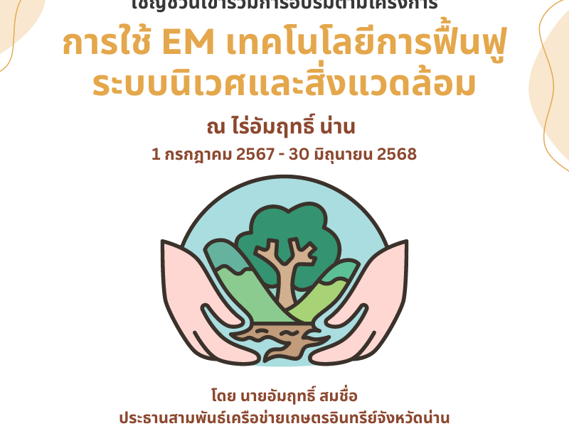 ขอเชิญชวนผู้นำ กลุ่มองค์กร และเครือข่ายที่มีความสนใจ เข้าร่วมการอบรมตามโครงการ “การใช้ EM เทคโนโลยีในการฟื้นฟูระบบนิเวศและสิ่งแวดล้อม”
