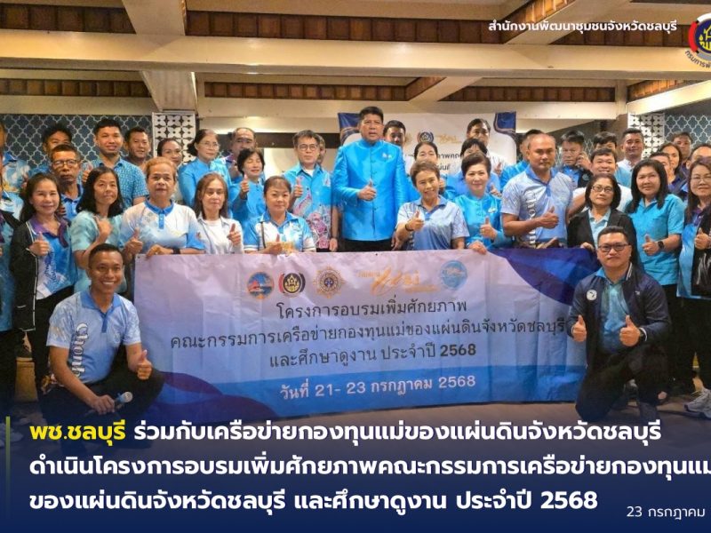 พช.ชลบุรี ร่วมกับเครือข่ายกองทุนแม่ของแผ่นดินจังหวัดชลบุรี ดำเนินโครงการอบรมเพิ่มศักยภาพคณะกรรมการเครือข่ายกองทุนแม่ของแผ่นดินจังหวัดชลบุรี และศึกษาดูงาน ประจำปี 2568