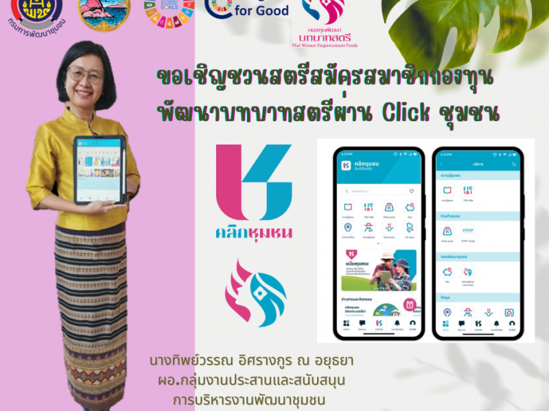 ขอเชิญสตรีที่มีอายุ 15 ปีขึ้นไป สมัครสมาชิกกองทุนพัฒนาบทบาทสตรี ผ่าน Click ชุมชน #clickชุมชน #กรมการพัฒนาชุมชน