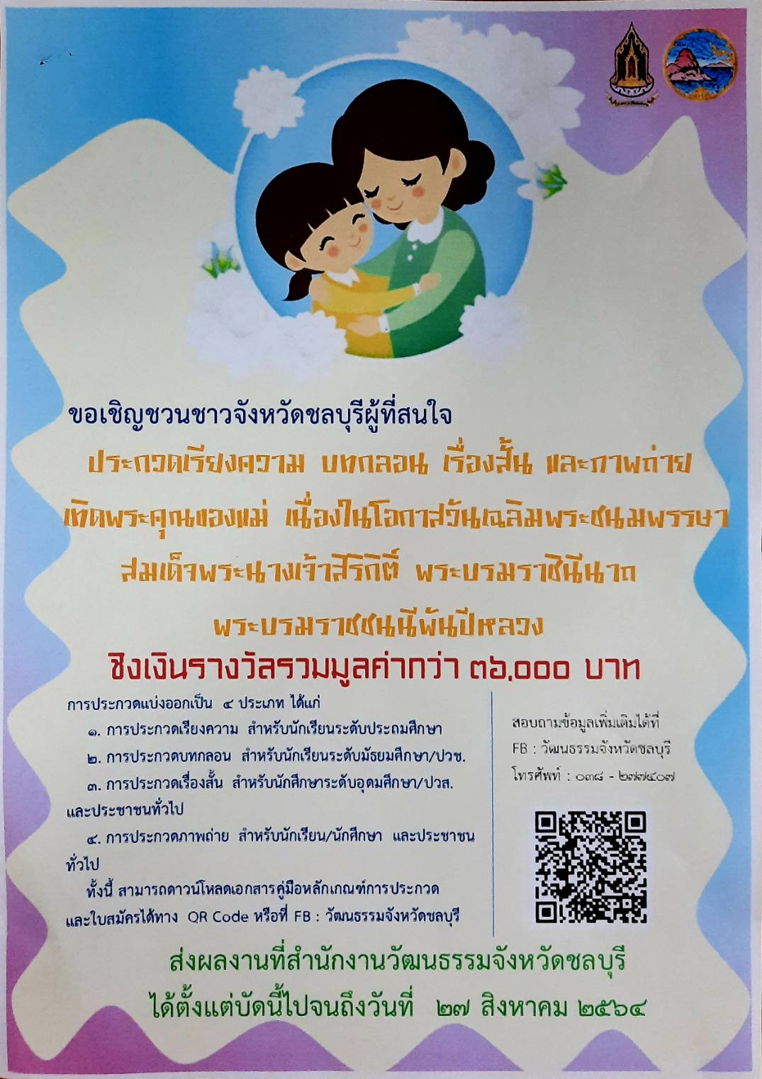 การจัดกิจกรรมประกวดเรียงความ บทกลอน เรื่องสั้น และภาพถ่าย เทิดทูนพระคุณของแม่ เนื่องในวันเฉลิมพระชนมพรรษา สมเด็จพระนางเจ้าสิริกิติ์ พระบรมราชินีนาถ พระบรมราชชนนีพันปีหลวง 12 สิงหาคม 2564