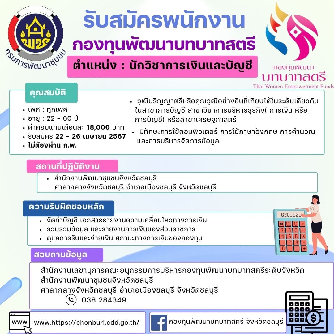 ประกาศรับสมัครพนักงานกองทุนพัฒนาบทบาทสตรี ตำแหน่ง นักวิชาการเงินและบัญชี